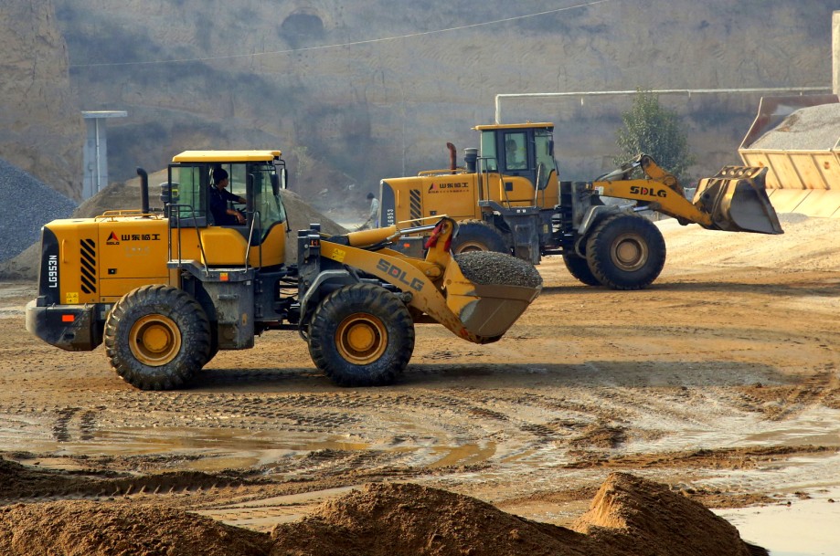 On site, four SDLG wheel loaders must navigate piles of gravel and sand interspersed with large water pits (which create thick mud). The aggregate material is mixed with the finer sand to produce concrete. In some parts of the site, the wheel loaders must scrape down to the river bed to dig out the course material before transporting it to the crushing machine for processing into concrete.