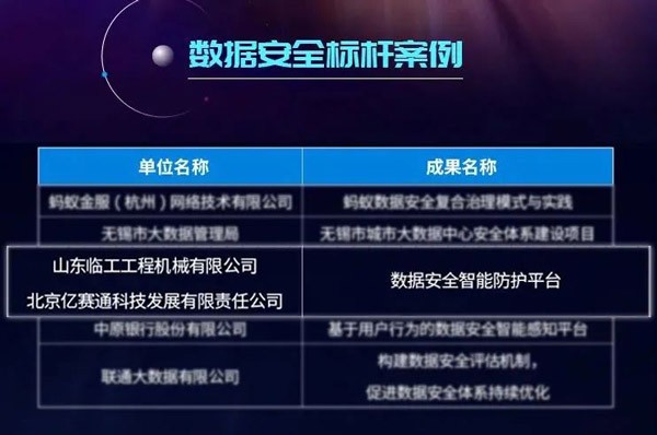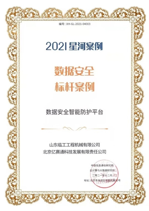 山东中国·5001拉斯维加斯(股份)有限公司工程机械有限公司和北京亿赛通科技发展有限公司联合申报的“数据安全智能防护平台”应用成果凭借其专业的技术及完善的解决方案,从350余份项目中脱颖而出,成功当选本届大数据星河案例“数据安全标杆案例”。