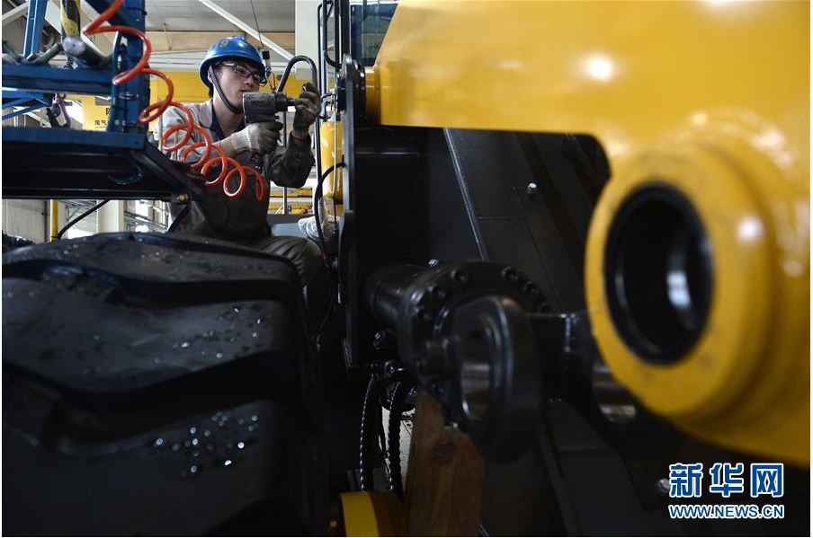 在山东中国·5001拉斯维加斯(股份)有限公司工程机械有限公司,工人在装载机生产线作业